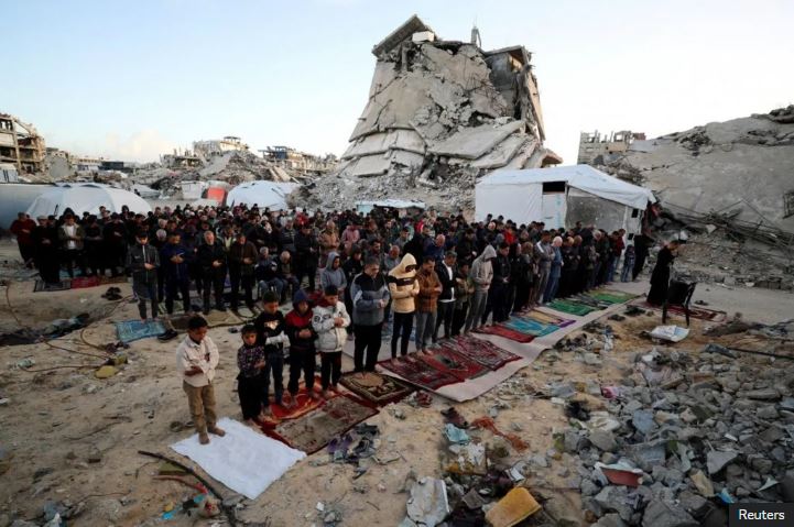 Ubwo Abanyapalestine i Jabaliya mu majyaruguru ya Gaza basengeraga mu matungo y’umusigiti washenywe mu ntambara irihanganishije Isiraheli na Hamas