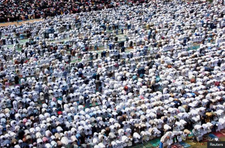 Ibihumbi by’abantu bateraniye mu isengesho ubwo bizihizaga Ilayidi mu mbuga ya Tononoka i Mombasa muri Kenya.