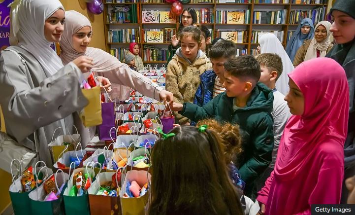 Abana b’abayisilamu ubwo bahabwaga impano i Lviv, muri Ukraine, mu gihe intambara y’u Burusiya kuri iki gihugu ikomeje