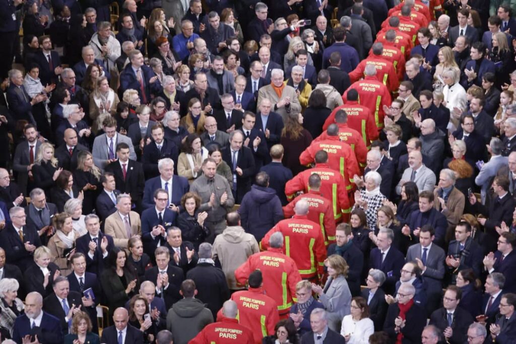 Hanze y’inzugi z’agatangaza za Notre Dame, Arkiyepiskopi wa Paris Laurent Ulrich yazamuye inkoni ye ayikomangisha ku nzugi inshuro eshatu maze agira ati “Bavandimwe, nimwinjire muri Notre-Dame.”