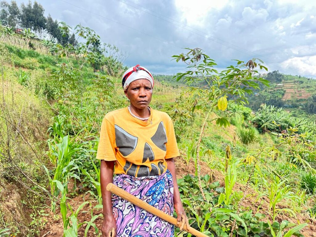Ati: “Mbere ubutaka bwatwarwaga n’isuri ntitweze. Ubu turahinga tukabona umusaruro ushimishije kuko badushyiriyemo n’ifumbire.”